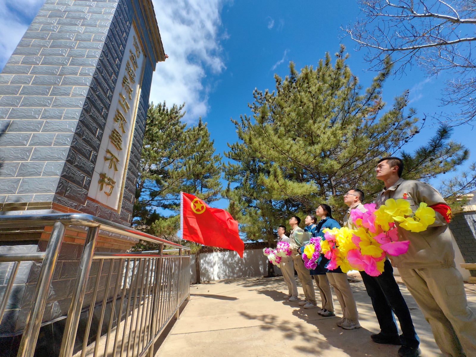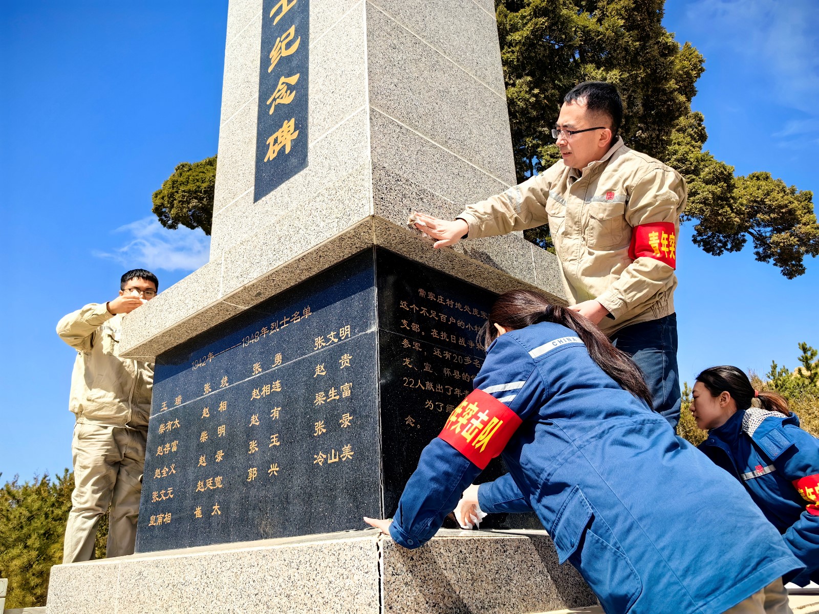 志愿者在常家庄革命烈士碑前整装肃立,向革命烈士默哀并敬献鲜花;聆听烈士的英勇事迹,继承英勇的革命精神,在工作中奋勇向前。志愿者还擦拭了烈士纪念碑,清理周围杂物保持陵园的肃穆与整洁。